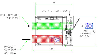 Standard 74” x 60” footprint shown. Box and Product Conveyor lengths will change for each application.
