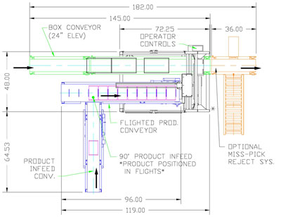 Standard 72” x 48” footprint shown with perpendicular infeed conveyor orientation and optional miss-pick reject.  In-line infeed available, depending on spatial constraints.  Box and Product Conveyor lengths will change for each particular application.