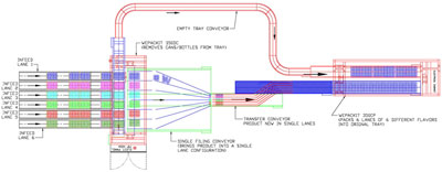 Decaser removes bottles from 24-count tray, single files 1-6 different flavors and re-packs the rainbow configuration back into the original tray.