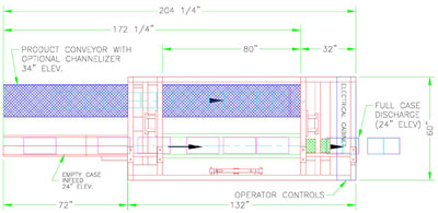 Standard 350CP shown with a standard 80” long load area packing 3 cases at once, which can be expandable to load up to 6 cases at once.  Box and Product Conveyor lengths will change for each application.