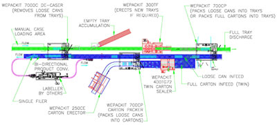 Example of a variety pack layout for 8oz, 12oz, 12oz Slim, 16oz and 24oz cans.  Decase from 24 count tray and pack into multiple pack cartons (4, 6, 8 or 12), then pack cartons into original trays.  Optional single filer to labeler and back to carton packer.