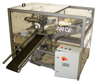 After the blanks are loaded vertically onto the machine, one carton blank is stripped from the magazine through vacuum cups. As the carton is moved to the erecting position it is pushed along a plough to pre-break the carton. As it reaches the drop position, a pneumatically actuated arm pushes the opposite corner, erecting it and over-squaring it. The carton naturally bounces back into the open and locked position. Once erected, the carton is dropped onto the discharge conveyor for transport out of the machine. |